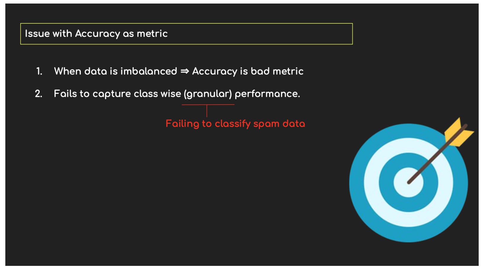 When data is imbalanced, accuracy alone is misleading. A model that predicts "Not Spam" for everything achieves ~70% accuracy while being completely useless!