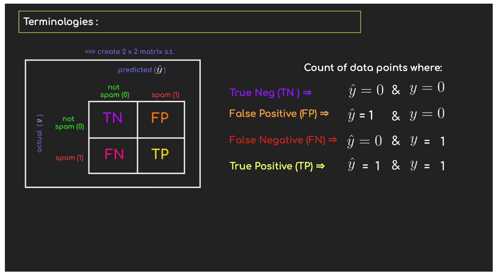 - True Negative (TN): $\hat{y} = 0$, $y = 0$ — Correctly identified non-spam